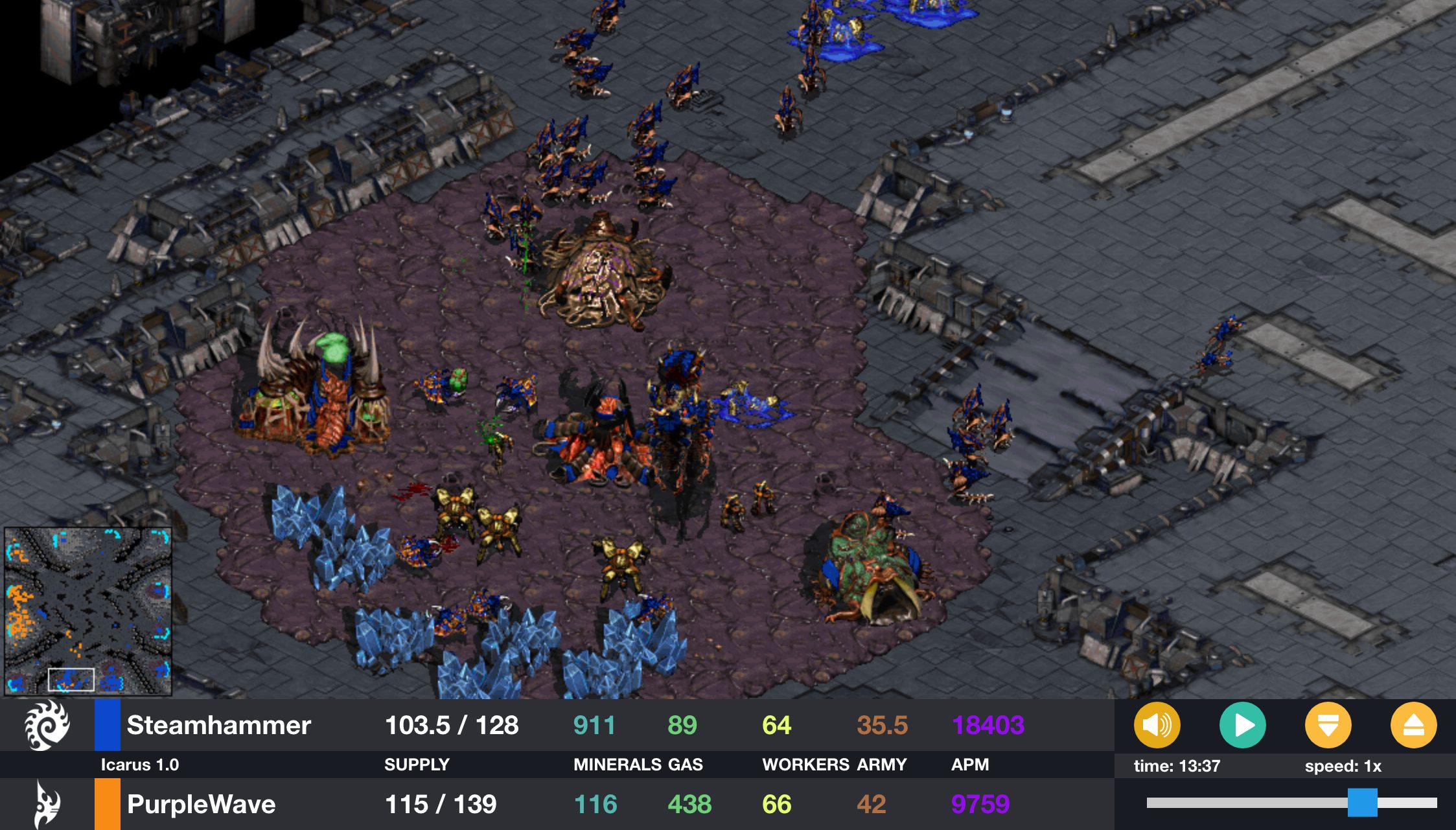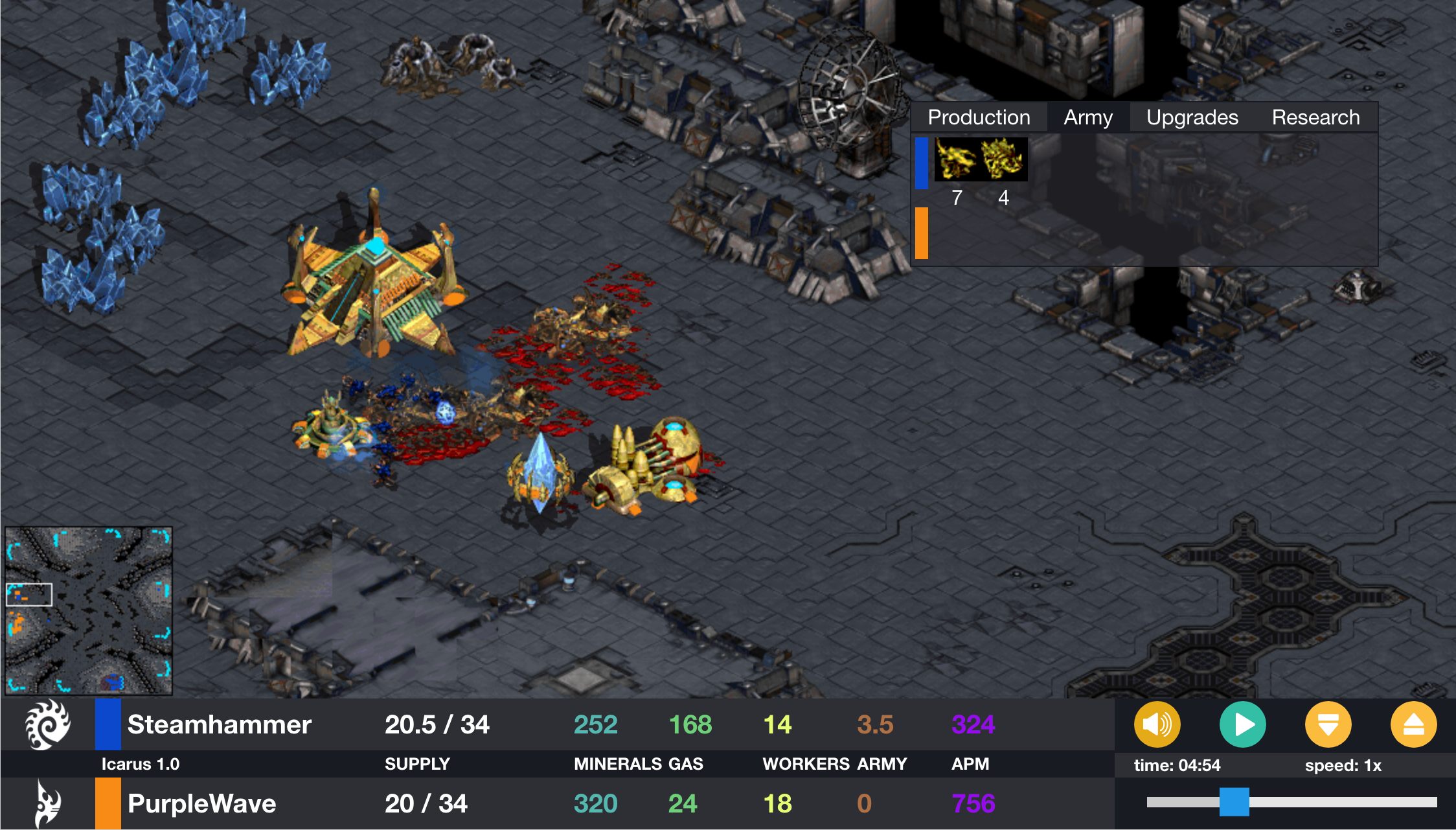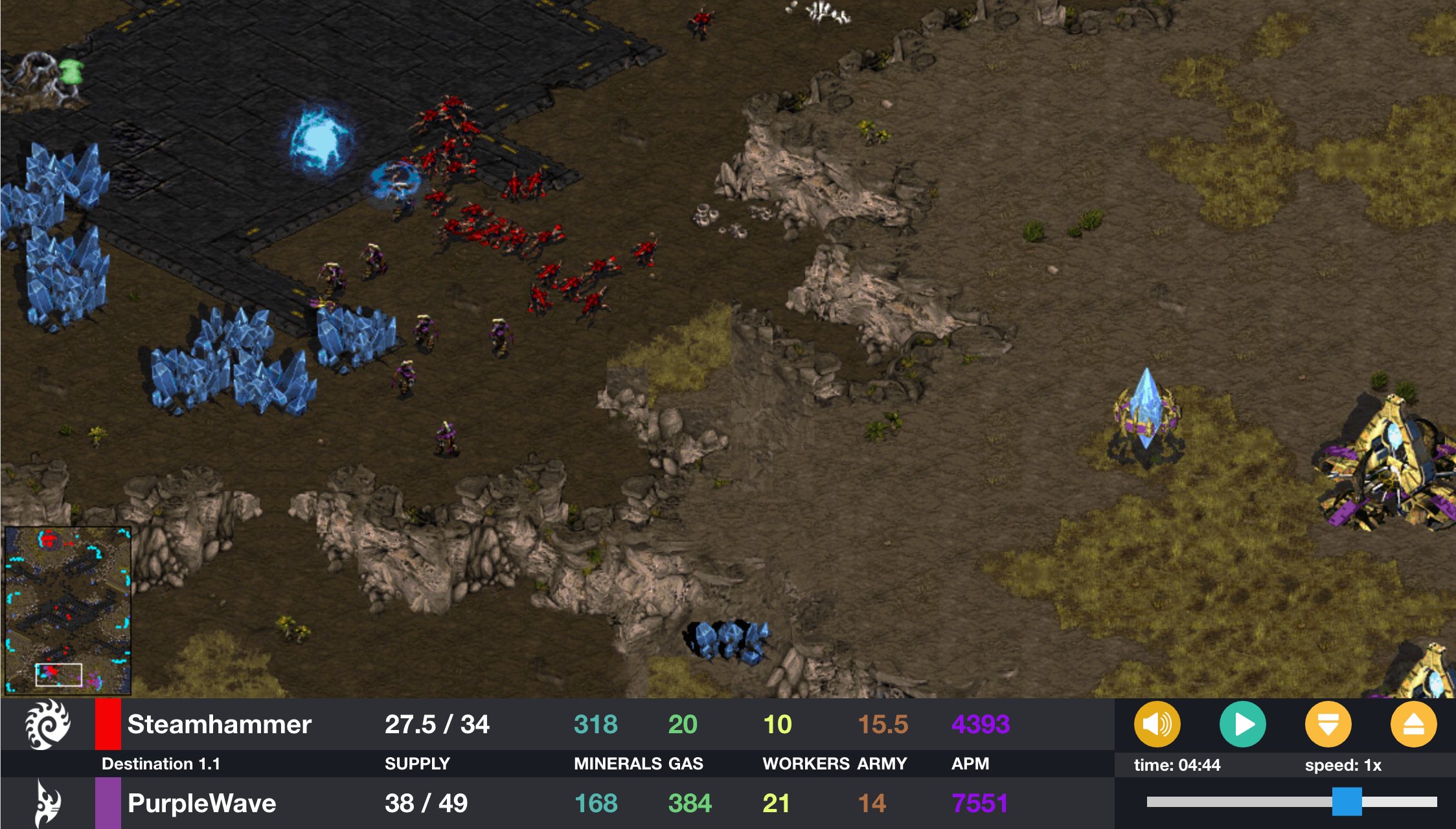 PurpleWave went 2 gate zealots into expansion. Neither bot had much understanding of the situation. Steamhammer massed lings, an all-in play to smash the opponent. In practice it’s successful against most bots, but zerg ends up way behind in economy. Protoss can play defensively for a while and then win easily—that’s how Tyr protoss beats Steamhammer.