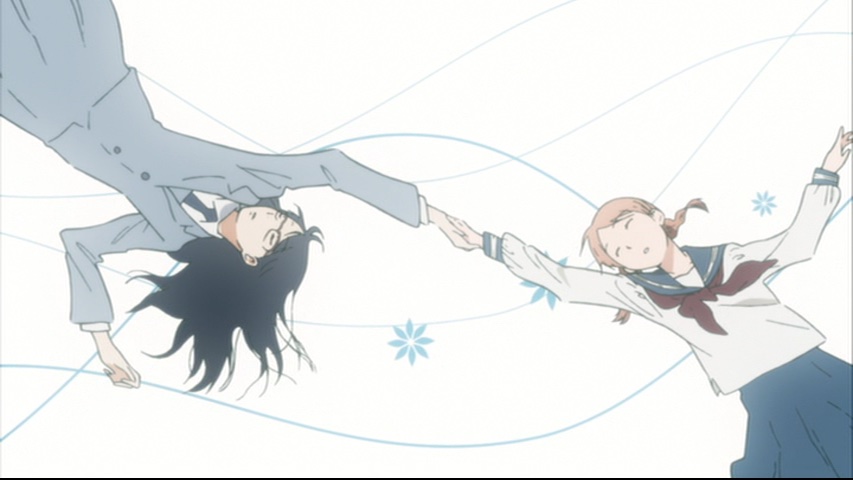 Bocchi’s long pink hair and blue eyes are close to Utena’s colors. Bocchi wears her track suit rather than (or over) the school’s standard uniform, ignoring the dress code like Utena. Bocchi is a hero—“guitarhero”—and commits occasional heroism to keep her band on track. Well, she has severe social anxiety, so ordinary actions can be heroic for her. Her first heroic act is in episode 3, where after an Utena-like hand-bandaging incident she brings Kita back into the band. First she falls on her front, like Utena when backstabbed, then she rises to the occasion like Utena opening the Rose Gate. Bocchi reaches out to suffering and self-isolating Kita and helps bring her in; Utena reaches out to suffering and isolated Anthy and helps bring her out.