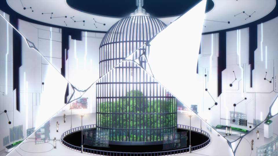 It is a reference to Anthy’s greenhouse. You could try to tell me otherwise, but I would only smirk at you. Too many points fit. It is suspended from above. The people in white are maintaining the system. The walls are marked up with asterisms, like Akio’s stars. The prisoner was a witch.