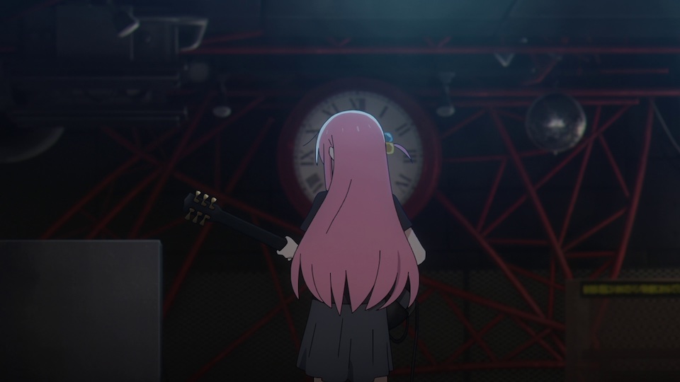 Another heroic act is in the band’s first concert. The band plays badly in the first song. Bocchi won’t let it stand and inspires them by playing an unplanned prelude to the next song, with her full guitarhero skills. A clock behind her head becomes a halo of hours as the blue light of heaven shines on her (actually it’s the venue’s lighting effects). The religious symbols and reference to time struck me as Utena-like. It reminds me of Utena as Jesus.