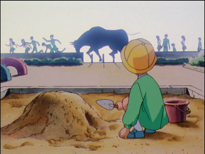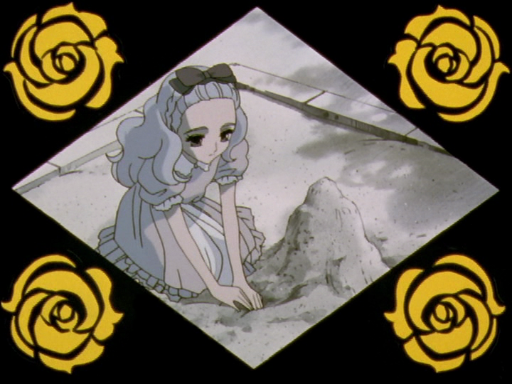 In the sandbox, Mitsuru has built a mound of sand with a tunnel at the bottom. It is oh-so-plainly female—though the arms of sand around the bottom remind me of an octopus. It seems to point to his future relationship with Nanami. In Nanami’s Egg, she dreams of being a little girl playing in the sandbox. She has built a kind of tower of sand with a hole at the bottom where she is about to find the egg. The hole and egg are female, but the pile of sand has a less definite shape and could be male. It may tie Nanami back to Mitsuru. It may compare Nanami to Anthy, who (like Utena) is half male, though it doesn’t usually show. Maybe the sand tells their sexuality. Or something else?